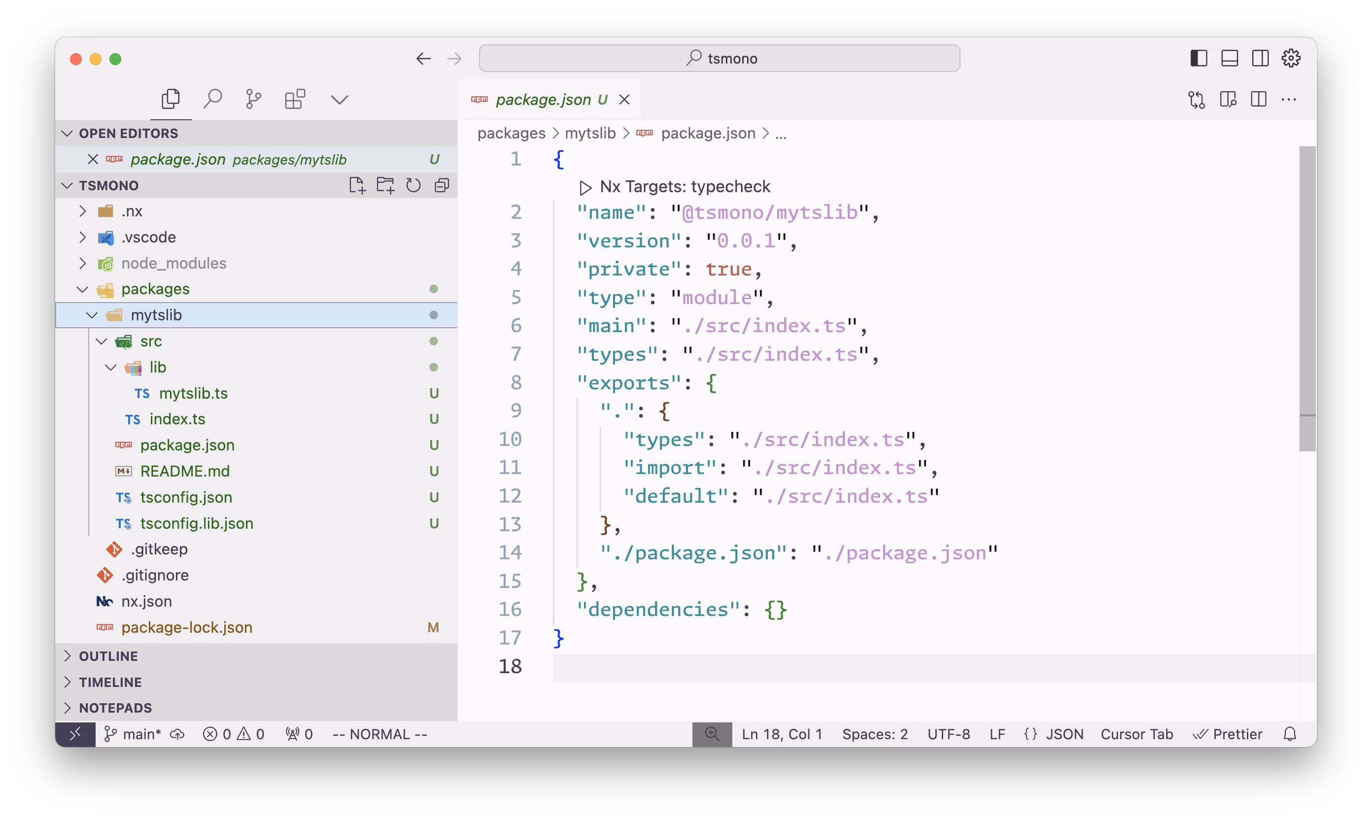 • a @nx/js dependency in the root-level package.json; this is because we created a TypeScript monorepo setup which ships with support for creating and managing TS based packages.