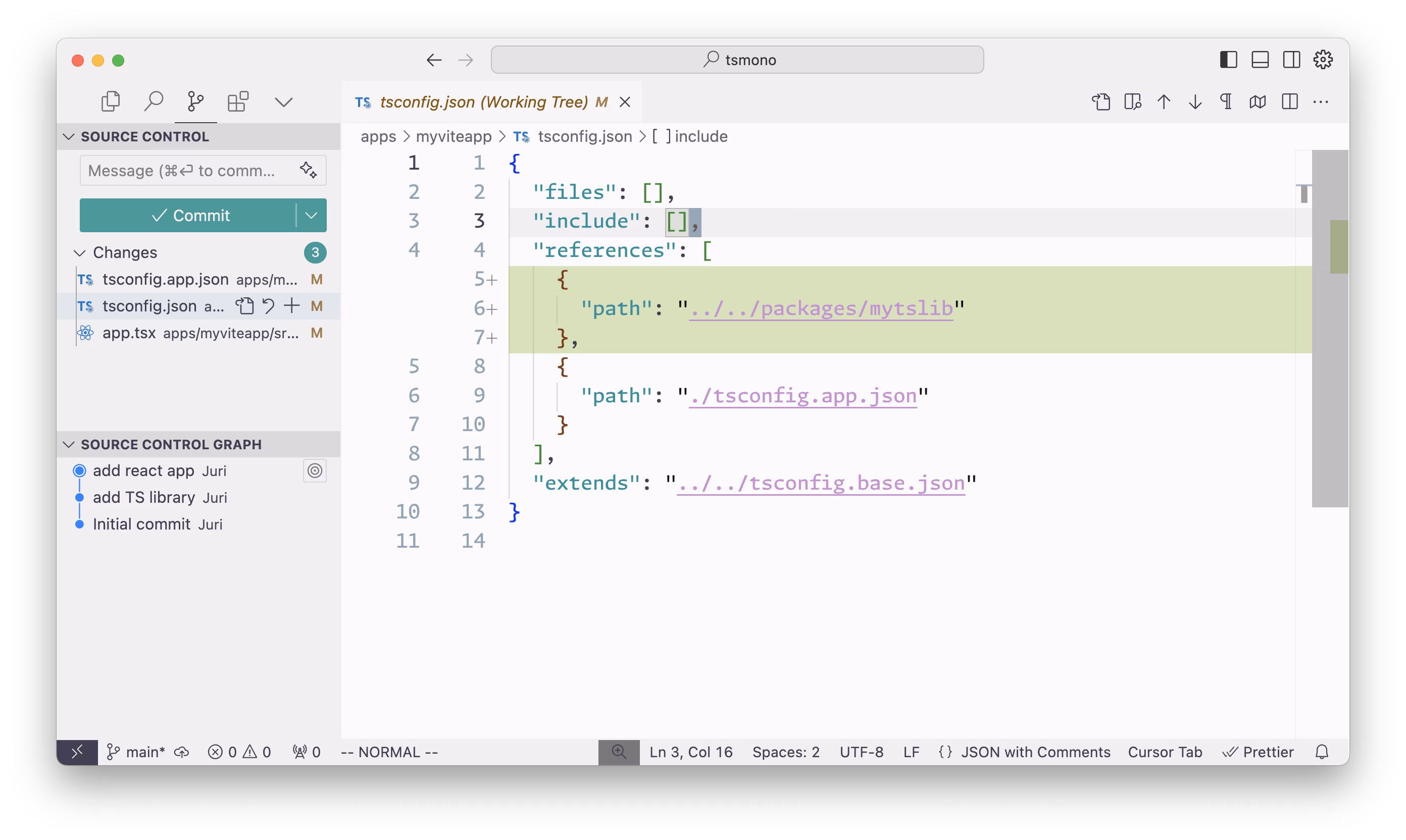 For example, after importing mytslib into myviteapp, you'll notice that apps/myviteapp/tsconfig.json now includes a reference to mytslib, ensuring your project remains correctly configured:
